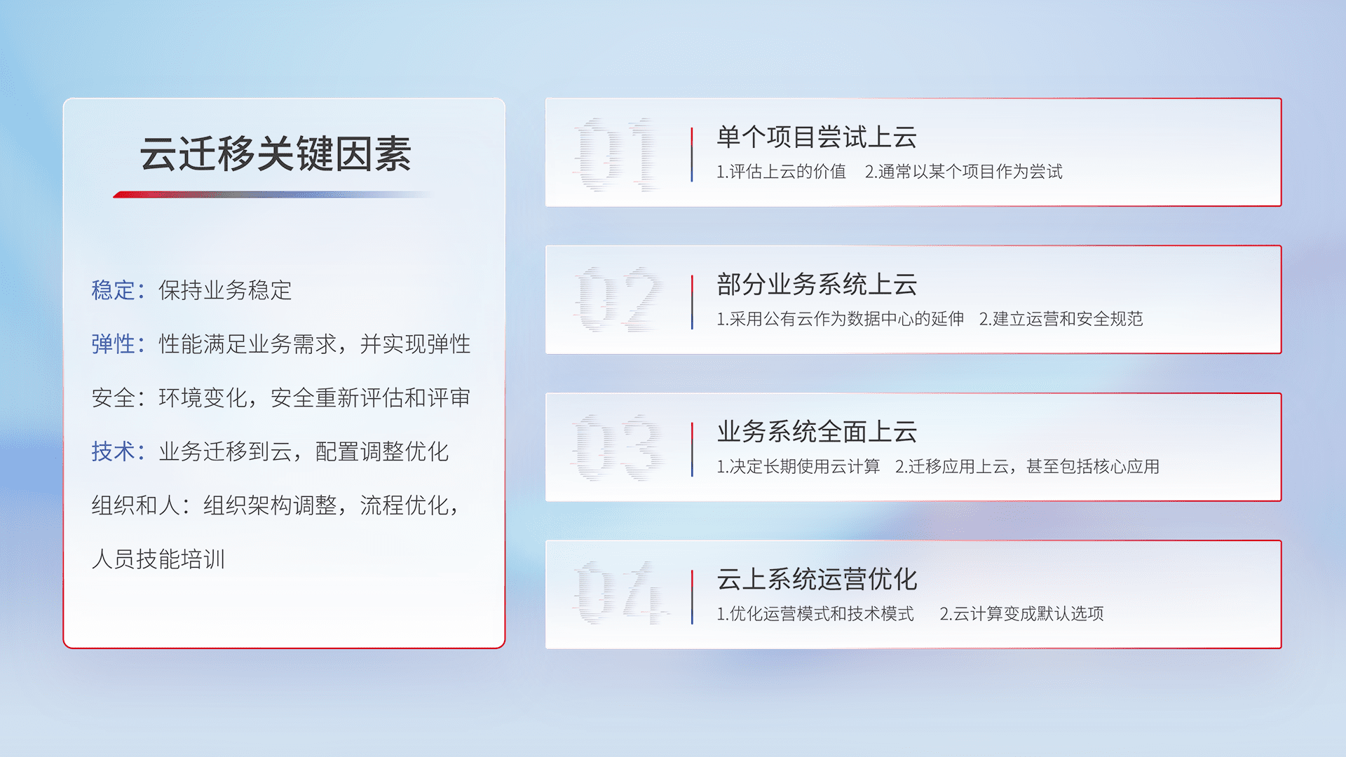 结合实际业务,,从规划设计、、云平台选型、、云原生改造、、、、数据迁移、、、、集成交付,,,,迁移全过程为客户识别最佳上云路径,,,做好风险识别管理,,,设计网络架构、、、身份权限、、安全审计合规、、、、操作审计、、、、日志审计、、监控告警策略、、多站点容灾设计等,,对云上基础设施进行整体规划,,提升IT治理水平,,,,以满足弹性、、、、高可用、、、、高性能的需求。。