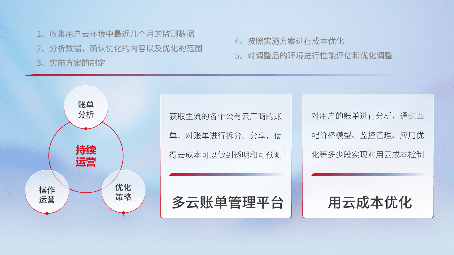 通过多云纳管,,以统一的资源数据模型把客户的云资源进行抽象和封装,,,进而实现对多云资源的统一操作,,,保障云资源管理的可靠性、、、稳定性与可用性。。。量身定制化运维内容,,,,配置、、、、开发运维、、、补丁管理、、备份、、、、监控、、、认证和访问管理、、、、审计和日常巡检等,,保障在用云过程中的可靠度,,,,稳定度以及高可用率。。。。