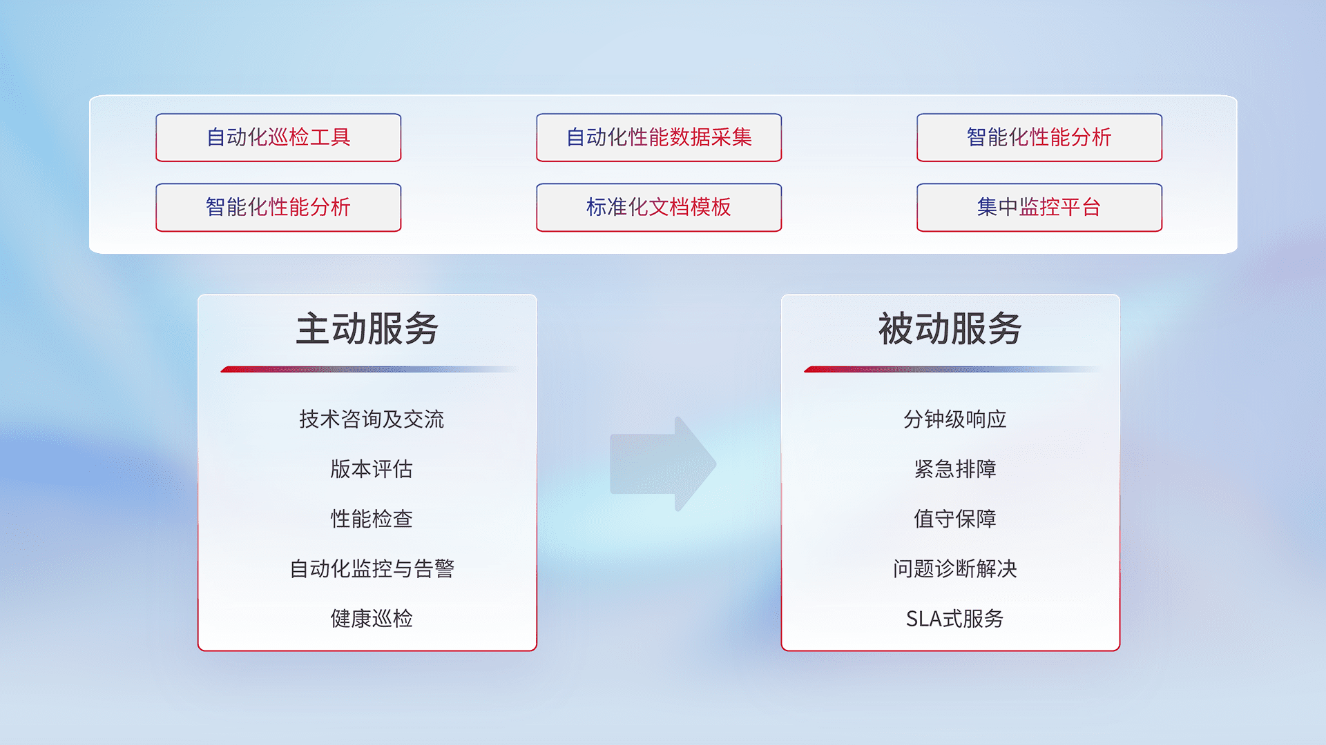 智能化工具和标准化文档,,,保障服务质量,,,,提供主动服务(包含技术咨询、、版本评估、、、、性能检查、、自动化监控与告警、、、健康巡检)和被动服务包含(分钟级响应、、紧急排障、、、、值守保障、、问题诊断解决、、SLA服务)。。。
